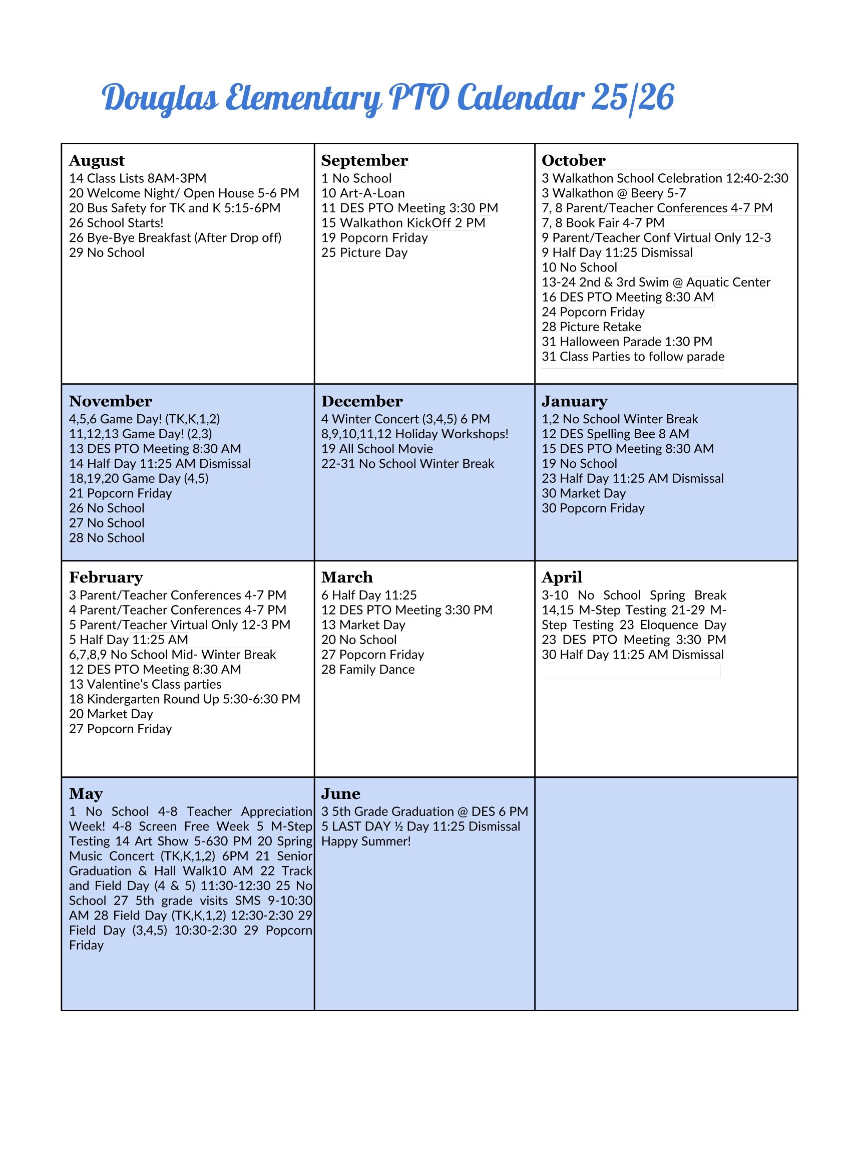 “The mission of the Douglas Elementary School PTO is to foster a welcoming, inclusive community where families, teachers, and staff work together to support every child’s academic, social, and emotional growth. We provide resources, enrichment, and opportunities that empower students to thrive both in and out of the classroom.”