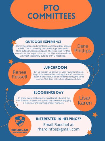 “The mission of the Douglas Elementary School PTO is to foster a welcoming, inclusive community where families, teachers, and staff work together to support every child’s academic, social, and emotional growth. We provide resources, enrichment, and opportunities that empower students to thrive both in and out of the classroom.”